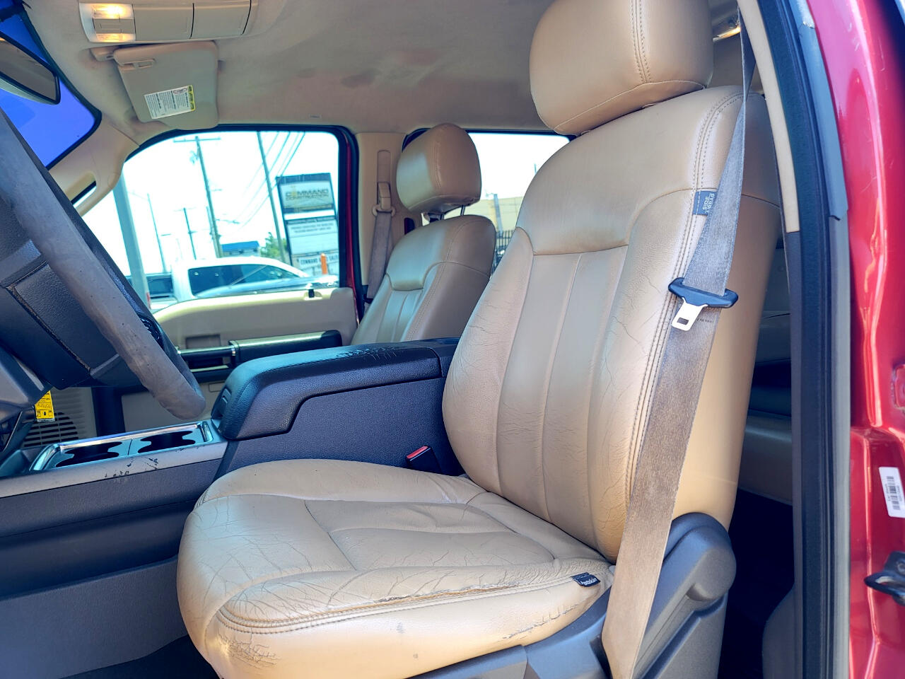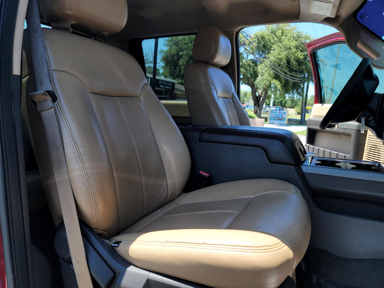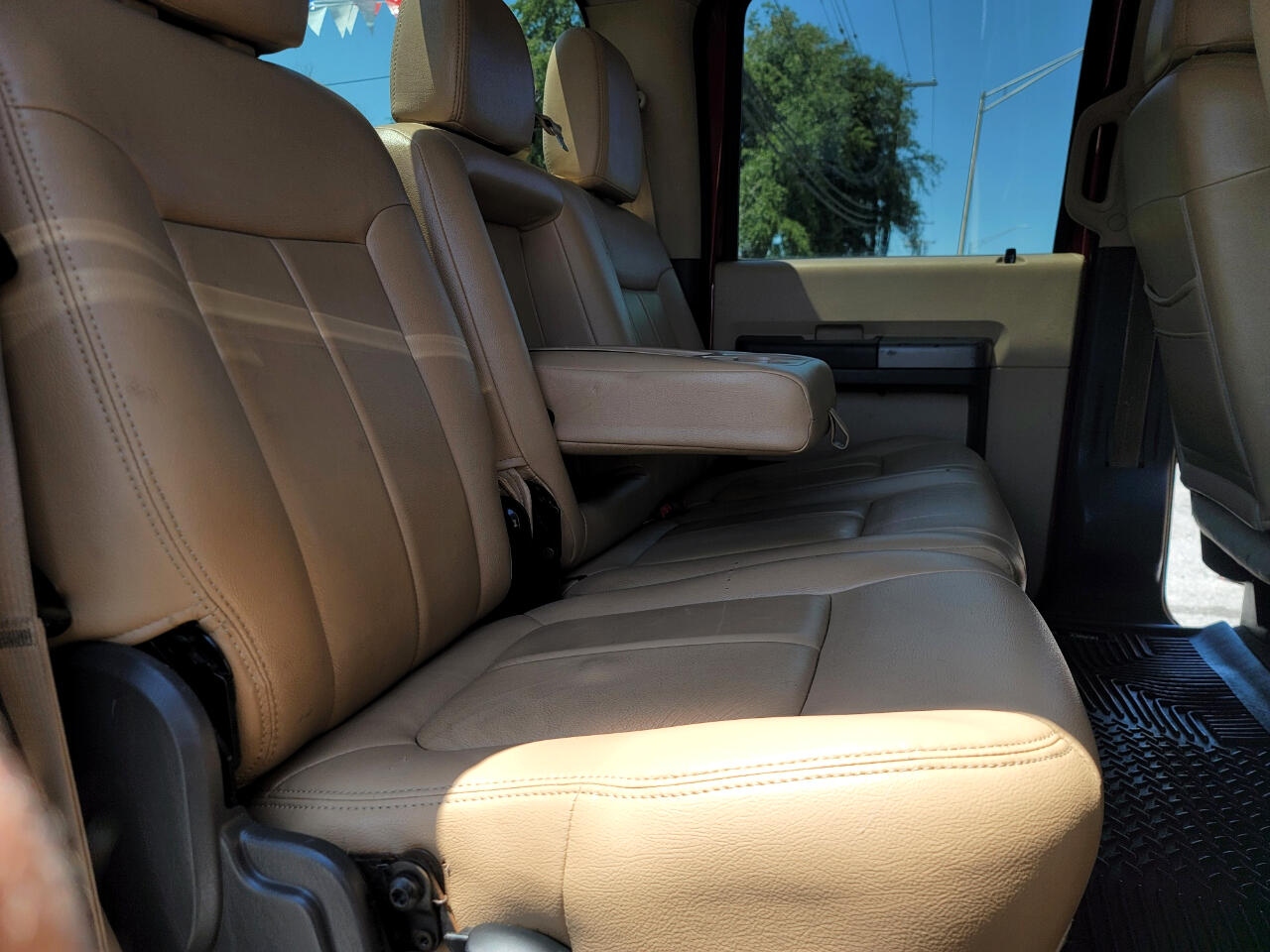 2015 FORD F-250 SUPER DUTY LARIAT, RED, 4WD, BIODIESEL, B20 CAPABLE, CREW CAB, BEIGE LEATHER INTERIOR, BLUETOOTH, AUTO DIMMING REAR VIEW MIRROR, TINTED WINDOWS, BRAKING ASSIST, CRASH SENSORS, PARKING SENSORS, TRAILER HITCH, DUAL ZONE CLIMATE CONTROL, ELECTRONIC 4WD SELECTOR, EXTRA CLEAN!